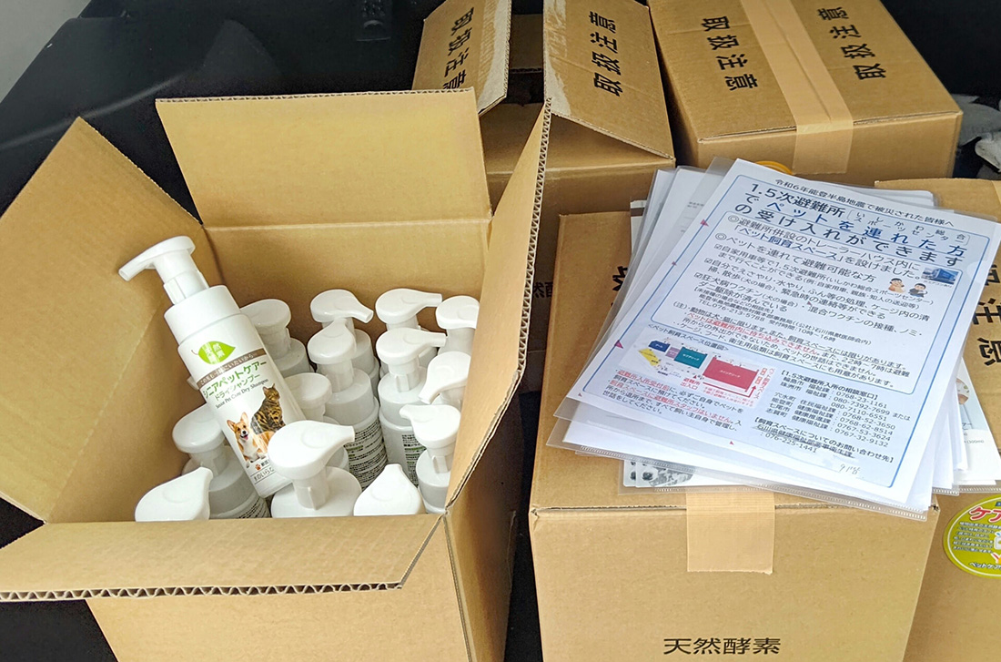 1.5次避難時では食料となる餌や排便シートなどが豊富に寄贈されていましたが、そろそろ「ケアー商品」が望まれるフェイズになってきたとグループリーダーの専門員の出雲路智さまが言っておられ、弊社の「水の要らない酵素シャンプー」は時期を得たタイムリーな商品であるとのお言葉も頂きました。